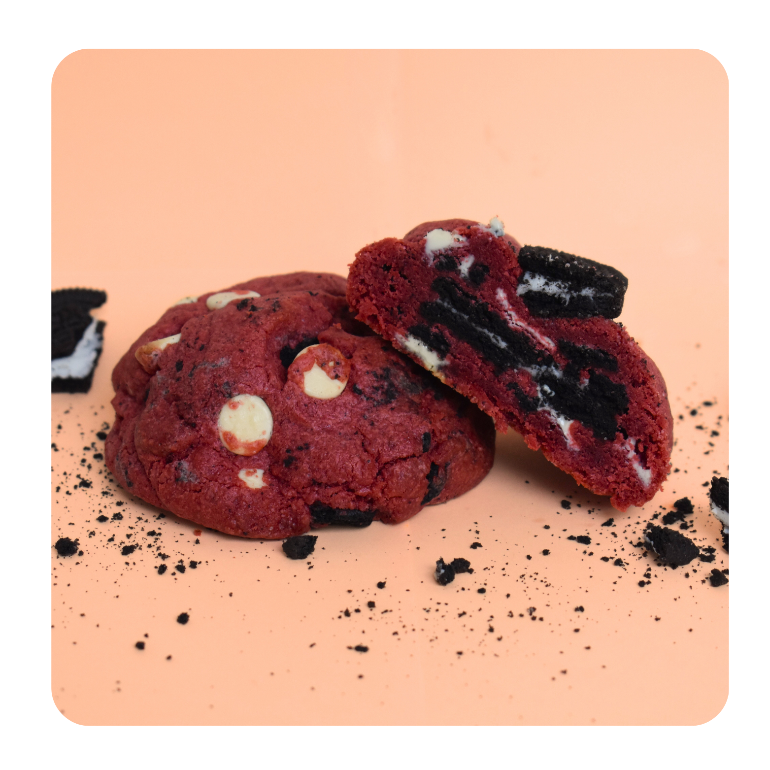 zelfrijzend bakmeel, tarwebloem, roomboter, basterdsuiker, suiker, ei, cacao, bakpoeder, zout, rode kleurstof, Belgische witte chocolade 16,2% : (Suiker ; cacaoboter ; volle melk poeder ; emulgator: soja lecithine ; natuurlijk vanille aroma), Oreo’s 10,2% :(tarwebloem, suiker, palmolie, koolzaadolie, magere cacaopoeder 4,3 %, tarwezetmeel, glucose-fructosestroop, rijsmiddelen (ammoniumcarbonaten, kaliumcarbonaten, natriumcarbonaten), zout, emulgator (sojalecithinen), zuurteregelaar (natriumhydroxide), aroma)